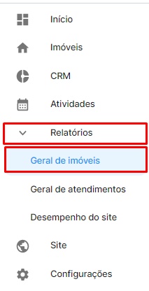 Para acessar o Relatório Geral de Imóveis, no menu localizado no canto esquerdo, clique em "Relatórios". Em seguida, será exibido um submenu, onde você deve clicar na opção “Geral de Imóveis".