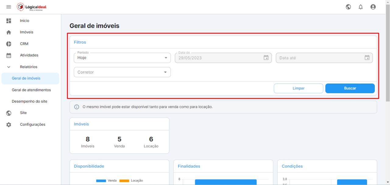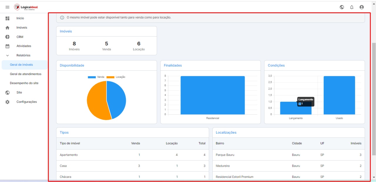 Esse tipo de relatório apresenta alguns dados, como o número total de imóveis cadastrados, a distribuição por categorias (como venda e locação), finalidades, tipos, localização, condições, entre outras informações.